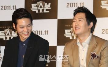 주원.김정태가 26일 '특수본' 제작보고회가 열린 롯데시네마 건대입구에서 밝은 포즈를 취하고 있다. '특수본'은 한번 문 사건은 절대 놓치지 않는 동물적 감각의 강력계 형사가 잔인하게 살해된 동료경찰의 살인사건을 접수한다. 본능적으로 단순 사건이 아님을 직감해 특별수사본부를 구성한다. 사건을 파헤칠수록 내부에서 이상한 기운을 감지, 밝힐 것인지 덮을 것인지를 고민하는 최강 특수본의 숨막히는 액션 수사극이다.양광삼 기자 [yks02@joongang.co.kr] 2011.10.26 13:24