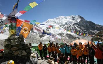 '라마여, 굽어 살피옵소서'2007 한국 로체·로체샤르 원정대가 4월 1일 오전 10시(현지 시각) 라마제를 지내고, 무사히 등반을 마칠 수 있도록 빌었다. 청록색 하늘 아래 도도히 서 있는 로체(8516m) 남벽 오른편 베이스캠프(5220m) 상단에 마련된 제단에는 네팔 제사 음식과 한국 원정대가 가져온 음식들로 채워졌다. 너럭 바위를 기단으로 작은 돌맹이를 쌓아올린 제단의 중앙에는 전통적인 라마 불교의 제상이 차려졌다. 한켠에 부처의 사진과 중앙엔 다다르(달라이 라마를 상징하는 조형물), 도르마(산양을 형상화한 음식), 잠바(일종의 약과)를 놓았다. 그리고 제단 윗부분으로는 대원들의 등반 장비를 빙 둘렀다. 한 대원의 헬멧에 씌여진 "할수 있습니다 그리고 믿습니다"라는 문구가 거대한 로체 남벽에 대한 의연한 자세를 보여준다. 제단의 기단 밑으로는 원정대가 가져온 갖가지 음식과 과일들로 빙 둘러싸고, 그 중앙에 라마가 자리를 잡았다. 2007 한국 로체샤르,로체 남벽 원정대의 성공과 무사귀환을 기원하는 라마제가 1일 오전(현지시간) 로체봉 앞 베이스캠프에서 열렸다.라마제 도중 대원들이 제물로 바친 쌀을 공중에 뿌리고 있다.원정대는 라마제가 끝난뒤 바로 장비 캠프를 비롯한 캠프 구축에 나서게 된다.캠프 구축이 예정대로 진행될 경우 정상 등정은 5월 중순경이 된다. 로체=김춘식 중앙일보 기자밍마 도르지 라마는 베이스캠프에서 5시간 거리인 팡보체 사원(Pangboche Monastrey)에서 특별히 이번 라마제를 위해 1일 아침 합류했다. 동네 할아버지를 연상시키는 폴라텍 소재의 상의와 편한 바지를 입은 상태에서 왼쪽 어깨에 추바(짙은 감색의 라마 승복)를 걸친 뒤, 경전을 읽기 위해 검정테 안경을 꺼내 들었다. 밍마의 앞에는 다시 제상이 차려졌는데, 차와 창(세르파 가정에서 만드는 일종의 막걸리)을 놓고, 그 옆으로 쌀이 가득 담긴 접시를 놓았다. 오전 10시가 되자 밍마는 조용한 음성으로 제를 주관했다. 밍마는 양 손에 북셀(바라)을 들었고, 옆에 앉은 세르파는 응아(북)를 들었다. 북셀과 응아을 치고 난 뒤 들릴 듯 말 듯한 음성으로 20여분간 경전을 읊었다. 그 사이 주변에 있는 세르파들은 오색 룽다(깃발)가 걸린 기둥을 세워, 제단에 살포시 얹어 놓았다. 밍마는 좀 더 빠른 장단으로 독경하며, 찹(튜라는 나뭇가지에서 우려낸 물)을 사방으로 뿌린다. 세르파들은 다시 오색룽다가 묶여 있는 기둥에 다섯 갈래의 룽다묶음을 길게 늘어뜨려놓는다. 밍마의 독경은 계속되고, 세르파들은 오색 룽다가 걸린 기둥을 제단의 맨 꼭대기에 올려놓는다. 제단 주변은 빨래줄에 만국기가 휘날리는 듯 하다. 제가 진행되는 동안 대원들은 말이 없다. 묵묵히 지켜보는 대원들의 의연한 표정과 선글라스 렌즈에 비친 웅장한 로체의 형상이 묘한 대조를 이룬다. 오색 룽다 기둥이 세워지고, 한 세르파가 대원들에게 쌀을 조금씩 나눠준다. 라마의 독경이 잠시 침묵을 고하고, 세르파들의 함성과 함께 대원들의 손에 쥔 쌀은 제단에 뿌려진다. 같은 방법으로 밀가루를 제단에 뿌린다. 초지일관 숙연했던 분우기는 엄홍길(47 트렉스타) 대장이 대원들 얼굴에 밀가루를 뿌리면서 다소 긴장이 풀리는 듯 하다. 세르파들도 자기네들끼리 얼굴에 밀가루를 뿌려가며 유쾌한 분위기다. 라마제는 지난 2003년 엄홍길 대장과 함께 로체샤르를 등반하다 사고를 당한 박주훈, 황선덕 대원의 영혼을 달래는 묵념으로 마무리지었다. 엄홍길 대장은 "이제부터 진짜 시작이다"며 "'도전, 인간 한계를 넘어'라고 정한 이번 등반의 기치가 부끄럽지 않도록 최선을 다할 것"이라고 소감을 밝혔다. 이에 앞서 원정대는 29일, 로체 남벽 아래 왼편 5220m 지점에 베이스캠프를 구축했다. 22명의 원정대원과 17명의 세르파가 80여일 간 머물게 될 베이스캠프는 로체 아래 '코리안타운'을 연상시키는 대규모 텐트촌이 됐다. 대원들이 머무르게 될 12동의 텐트와 세르파 숙소 7동, 식량과 장비 저장 텐트 5동, 주방과 식당용으로 쓰일 대형 텐트 각각 1동, 일명 '패밀리룸'으로 불리게 될 20인용 대형 돔 텐트 1동, 그리고 화장실 텐트 4동이다.로체 베이스캠프(네팔, 5220m)=김영주 기자 2007.04.02 19:08