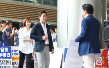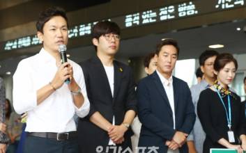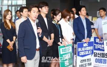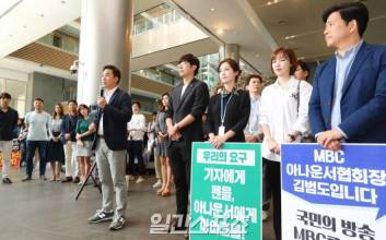 KBS 아나운서들이 공영방송 정상화를 위해 제작거부에 나선 MBC 아나운서를 찾아 힘을 실어줬다.김범도 MBC아나운서 협회장이 윤인구 아나운서 등 KBS 아나운서들이 31일 오전 서울 상암동 MBC를 찾아 파업 지지와 연대의 뜻을 밝히기 위해 도착하자 소개를 하고 있다.현재 MBC는 9월 4일 총파업을 앞두고 있으며 KBS 양대 노조 역시 파업 동참 의사를 밝히며 7일 파업을 시작한다. 김민규 기자 kim.mingyu@joins.com /2017.08.31/