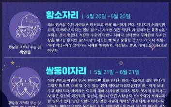 자료제공 : 점신 물병자리 (1.20 ~ 2.18) 싱글벙글 당신의 미소가 주위사람들을 기쁘게 만드는 날이다. 점수 따기 좋은 날! 오늘 이상하게 주위 분위기가 살벌한 것이 당신이 분위기 메이커 역할을 확실하게 해주면 인기남, 인기녀 되기 딱 좋은날이다. 여럿이 함께 진행하는 과제가 있다면 당신의 재주를 발휘하기 좋다. 머리 써서 움직이는 일 보다는 몸으로 움직이는 게 더 잘맞는 날이다. 너무 잘난체 한다는 인상을 주면 어디선가 당신을 시기하는 무리가 트집을 잡을 수도 있는 날이니 강약을 조절할 것! 행운을 가져다 주는 것 : 장미꽃 한 송이 선물하기 물고기자리 (2.19 ~ 3.20) 으슬으슬 괜히 추운 것도 같고, 몸이 허한 것도 같고. 겉보다는 내실을 챙겨야 하는 날이다. 아침밥도 챙겨먹고 영양가 높은 음식도 챙겨먹자. 허한 속 내버려두면 맘까지 허해질 수 있다. 외출시에는 살짝 변화를 줘보는 것도 좋다. 평소 스타일과 조금 다른 의상을 소화해보자. 의외로 잘 어울리는 스타일을 찾아낼 수 있는 날이다. 쉽게 피로해 질 수 있는 날이니 가급적 일찍 귀가할 것! 행운을 가져다 주는 것 : 실버 액세서리 양자리 (3.21 ~ 4.19) 오늘 날잡고 당신의 능력을 보여줘~ 상황대처가 빠르고 유머감각까지 받혀주니 선배 후배 친구들에게도 인기가 좋은 날이다. 공부하는 시간에도 머리가 잘 돌아가고 운동을 해도 오늘따라 몸이 잘 풀린다. 하루 종일 기분 좋은 일들만 생긴다. 선물을 해야 할 일이 생긴다면 향이 좋은 화장품이나 향수, 꽃 등이 좋고 애완동물을 기른다면 향이 좋은 비누로 씻겨주고 청소해주자. 오늘은 향기나는 물건들이 행운을 가져다준다. 행운을 가져다 주는 것 : 드라이기 황소자리 (4.20 ~ 5.20) 자주 끓는 것이 팥죽이라 했던가? 오늘 당신은 팥죽쟁이! 당신의 변덕이 더 자주 끓겠다. 잦은 심경변화로 여러 사람을 피곤하게 만들기 쉬운 날이다. 스스로 고독을 자처하지 말도록! 얼굴에 뾰루지가 올라온다. 신경이 예민한데 뾰루지까지 거슬린다. 컨디션도 별로다. 이런 날, 답은 하나. 얼른 집으로 들어가서 일찍 잠드는 것. 괜히 엉뚱한데 화풀이 하지 않도록 하자. 저녁엔 과식하지 않도록! 행운을 가져다 주는 것 : 헤드폰 쌍둥이자리 (5.21 ~ 6.21) 뭐 하고 싶은 거 없어? 언젠가 이것만은 꼭 해야지 하고 생각했던 것 들은? 오늘은 당신의 의견이 모두모두 받아들여지는 날이다. 이런 날 흔치 않지. 애인을 만나면 어디를 갈지 무엇을 먹을지 먼저 생각해두자. 당신의 모든 의견에 애인은 OK 할 것이다. 평소 볼 수 없었던 당신의 리드에 색다른 매력을 느끼게 될 애인은 당신을 한 층 더 사랑하게 될지도 모르다. 또한 회사나 학교에서도 당신의 의견이 받아들여 질 테니 미리미리 준비하도록 하자. 행운을 가져다 주는 것 : 코사지 게자리 (6.22 ~ 7.22) 연애와 결혼은 별개?! 섣부른 청혼에 오케이 하지 말자. 당신은 아직 할 일이 많이 남아 있지 않은가? 먼저 당신을 사랑하고 성장하는 것이 우선이다. 다른 사람과의 라이벌 의식보다는 스스로를 발전시키고 노력하는 것이 당신의 미래에 더 도움이 되겠다. 그런 일로 지쳐있을 당신이라면 잠깐의 휴식도 필요할 듯. 멀리가지는 말자. 못 돌아온다. 근처 공원이나 강가에 가서 가볍게 산책하자. 마음도 발걸음도 가벼워질 걸?! 행운을 가져다 주는 것 : 드라이브 사자자리 (7.23 ~ 8.22) 친구들과 당신이 좋아하는 스포츠를 즐겨라. 볼링, 테니스, 농구 등등 아무거나 괜찮다. 가벼운 내기라도 한 판~! 술내기 밥내기 주저하지 말고 걸어라. 오늘 당신은 돈 한 푼 없이 밥도 먹고, 술도 먹을 것이다. 누가 더 공을 많이 넣네, 누가 더 박수를 많이 받네, 질투할 것 없다. 당신은 최선만 다하자. 당신에게 주어진 한 번의 기회가 팀이 이길 수 있는데 큰 도움이 될 것이다. 자자 고고씽~! 행운을 가져다 주는 것 : 육개장 처녀자리 (8.23 ~ 9.23) 새로운 무언가를 계획하고 있는 당신! 생각은 많은데 갈피를 못잡는다면 오늘의 당신의 선배와 상담하자. 새로운 계획에 도움이 될 이야기를 듣게 될 것이다. 특히 가족과 의견을 나누면 의외의 돌파구를 찾을 수 있겠다. 지난일에 대한 미련이 발목을 잡고 있는 요즘, 이게 아니다 싶으면 과감히 접자. 지난일 때문에 지금 하는일도 앞으로 시작할 일도 질척거리고 있는 수가 많아보인다 스트레스를 풀고싶다면 동네 수영장에 가서 신나게 물장구라도 쳐보자. 물과 관련된 곳이 오늘 당신에게 잘 어울리는 장소다. 행운을 가져다 주는 것 : 콜라 천칭자리 (9.24 ~ 10.22) 차가 막혀서, 버스를 잘 못 타서. 핑계 댈 일이 많은 날이다. 약속시간보다 무조건 30분 일찍 나서는 게 좋겠으며 지키지 못할 약속은 애초에 하지 않는 것이 좋다. 핑계도 한두 번이지, 세번 네번 넘어가면 신용불량으로 낙인찍히기 딱 좋은 날이다. 오랜만에 변화가 필요한 날! 공부하던 방식, 평소 고수해오던 패션 스타일에 살짝 변화를 주는 것이 당신의 기분전환에도 좋겠고 주변 반응도 좋다. 새로운 사람을 소개받을 자리가 생길 수 있으나 말을 조심할 것. 행운을 가져다 주는 것 : 손수건 전갈자리 (10.23 ~ 11.22) 모래사장을 걷다가 뒤를 돌아보면 당신의 발자국을 볼 수 있듯, 지금 걸어