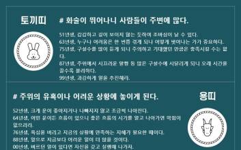 자료제공 : 점신 쥐띠 # 눈앞에 큰 이익이 있으나 여유가 없어 발견하지 못한다. 48년생, 두서없는 행동이 어찌 이뤄지겠는가. 고집을 버리자. 60년생, 혼자의 힘으로 목표 달성 어렵겠다. 72년생, 운세가 좋지 않아 뜻대로 되지 않으나 참고 인내하면 노력의 결실이 있겠다. 84년생, 아직 때가 아니니 좀 더 기다려야 한다. 96년생, 변화가 찾아오는 것을 두려워마라. 소띠 # 후회하고 있는구나. 하지만 곧 나아지니 휴식하라. 휴식이 좋은 약이 될 것이다. 49년생, 선후배의 도움을 구하라. 61년생, 재발된 병으로 가족에게 근심 준다. 73년생, 마음에 안정이 없고 중심이 없으니 하는 일마다 잘 안 되리라. 85년생, 바른 마음가짐을 가지고 분수를 알고 행동하라. 97년생, 너무 앞서서 결과를 예상하지마라. 범띠 # 모든 일이 원만하게 이루어질 것이다. 50년생, 허황된 생각을 버리고 지금 하는 일에 열중하라. 62년생, 노력이 소망을 이루는 지름길이다. 74년생, 노력의 결실을 얻게 된다. 기다리던 소식이 오는 운이다. 86년생, 첫 단추를 잘 끼워라, 다른 것은 다 필요없다. 98년생, 하고 싶은 것을 해라. 토끼띠 # 지금 현실을 냉철하게 판단하는 지혜기 필요할 시기이다. 51년생, 계속적으로 밀려오는 부채로 인해 어려운 시기다. 63년생, 집안에 경사가 있겠다. 그러나 너무 좋아하지 마라. 오래 가지 못한다. 75년생, 혈압이나 스트레스를 주의하라. 87년생, 더 가지려 말고 현재 것을 잘 간수하라. 99년생, 조금 더 인내하고 때를 기다려라. 용띠 # 꾀하는 일에 활기가 넘쳐흐른다. 52년생, 여행 가고자 하는 곳에 도적이 들끓는다. 다음기회를 기다리는 것이 좋겠다. 64년생, 바쁘게 움직여야 할 시기를 만났으니 계속 움직여라. 76년생, 건강이 나빠지게 되는 때이다. 각별히 신경 써야 하겠다. 88년생, 원대하고 하고자 하는 일은 많으나 그것이 한 순간에 이루어질 수는 없는 것이다. 00년생, 꾸준하게 건강을 관리해라. 뱀띠 # 하늘이 열리고 빛이 내려와 나를 비추니 부귀영화가 내 것이다. 53년생, 지금까지 해왔던 자세로 계속해서 행하면 좋은 결과가 있으리라. 65년생, 모든 일이 계획대로 된다. 즐거운 날을 보낸다. 77년생, 더 가지려 말고 현재 것을 잘 간수하라. 89년생, 지나친 욕심은 화를 부른다. 자중해라. 01년생, 바쁘다고 대충하면 후회한다. 말띠 # 고생한 보람도 없이 이윤도 남지 않으니 자칫 몸만 상해 버리는 것은 아닐지. 54년생, 가는 곳마다 사고가 기다리고 있다. 조심해서 행동하라. 66년생, 일은 풀리지 않고 얽혀 만 가는 구나. 78년생, 주변에 휩싸이지 말지어다. 90년생, 조그마한 소망은 이루어지니 너무 많은 것을 바라지마라. 02년생, 고집을 버리고 주위와 타협하라. 양띠 # 주위사람들 모두가 귀하의 편을 들어준다. 55년생, 좋은 사람들을 만나 맛있는 것도 먹고 즐거운 시간을 보낸다. 67년생, 현재의 위치를 지키는 것을 좋다. 다른 일은 좀 더 기다려야 한다. 79년생, 건강문제는 빨리 해결하는 게 좋다. 많이 악화될 수 있다. 91년생, 칭찬이나 혹은 용돈을 받을 수 있다. 03년생, 용기있게 행동해라. 원숭이띠 # 어려운 시기는 지나가고 안정된 생활이 이어질 것이다. 56년생, 주변의 사람들과 의논하고 실천에 들어가라. 결과는 좋으리라. 68년생, 자식들에게 안부 전화하도록 하라. 좋은 소식이 기대된다. 80년생, 친척의 도움을 받아 어려운 일을 쉽게 해결한다. 92년생, 중심을 잡아라. 바른 길을 걸어가야 한다. 04년생, 밝은 곳이 자신의 기운을 강하게 만든다. 닭띠 # 방식을 바꾸는 것을 절대 금물!!! 57년생, 귀하의 약점이 들어날 수 있다. 주의하라. 69년생, 생각도 못했던 곳에서 경쟁자 나타나리라. 81년생, 금전, 직장. 이성운 모두 불리하다. 93년생, 말실수 때문에 망할 수 있다. 조심조심 또 조심. 05년생, 경쟁보다는 타협을 해라. 개띠 # 의외의 일들을 걷게 되리라. 58년생, 지금까지의 삶을 재점검하는 시간을 가지도록 하라. 70년생, 사소하는 일에 신경 쓰지 말고 마음의 안정을 찾아라. 82년생, 금전운은 무난하다. 그러나 이외의 소득이 생길 수 있다. 94년생, 적성에 맞는 직장을 찾았으나 능력부족으로 입사하기 곤란하다. 06년생, 갑자기 생각나는 것을 메모해라. 돼지띠 # 말을 함부로 하지 마라. 입 조심. 59년생, 때로는 고집을 버리고 행동하는 것이 길하다. 71년생, 이성운이 좋은 시기에 있다. 이성과 즐거운 시간을 보낸다. 83년생, 지나친 자만심을 실패를 부를 수 있다. 겸손한 마음으로 사람들을 대하라. 95년생, 귀하보다 어린 분들과 즐거운 시간을 보내게 된다. 07년생, 고마움을 적극적으로 표현해라. 2020.10.26 00:01