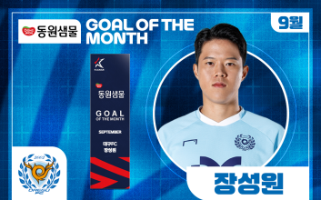 대구FC 장성원이 2025시즌 9월 K리그 ‘안심을 마시다 동원샘물 이달의 골’ 수상자로 선정됐다.동원F&B가 후원하는 ‘안심을 마시다 동원샘물 이달의 골’은 매월 가장 인상 깊은 득점을 터뜨린 선수에게 수여하는 상이다. 수상자는 K리그 멤버십 애플리케이션 ‘Kick’을 통한 팬 투표로 결정되며, 팬들은 두 명의 후보를 대상으로 기간 내 1일 1회씩, 총 3회 참여할 수 있다.9월 ‘이달의 골’은 K리그1 29~31라운드를 대상으로 했고, 후보에는 대구 장성원과 김천 김승섭이 이름을 올렸다.장성원은 29라운드 김천전 후반 20분 빨랫줄 같은 중거리 슛을 상대 골문 구석에 꽂아 넣었고, 김승섭은 30라운드 전북전 전반 38분 골키퍼의 손이 닿지 않는 곳으로 절묘한 슛을 성공시키며 득점을 기록했다.‘Kick’ 팬 투표는 이달 16일(목)부터 18일(토)까지 3일간 진행됐다. 그 결과 장성원이 6,643표(80.1%)를 얻어, 1,652표(19.9%)를 얻은 김승섭을 제치고 ‘9월 이달의 골’을 차지했다.수상자 장성원에게는 상금 100만원과 함께 트로피를 준다. 연맹은 올해부터 이달의 골 수상자의 친필 사인이 담긴 레플리카 트로피를 제작해 기부 경매를 진행하고 있다.김희웅 기자 2025.10.21 15:25