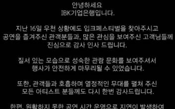 미흡한 공연 관리로 논란이 일었던 2023 입크 페스티벌 측이 결국 사과했다.18일 ‘2023 입크 페스티벌’ 측은 공식 인스타그램에 “관객들과 호흡하며 열정적인 무대를 펼쳐 준 모든 아티스트 분들에게 다시 한번 감사드린다. 한편 원활하지 못한 공연 시간 운영으로 지연이 발생하여 불편을 겪으신 아티스트들에게 죄송한 마음을 전한다”는 내용의 사과문을 게재했다.페스티벌 측은 “특히 준비한 무대를 다 보여주지 못한 지코와 오랜 시간을 기다려 준 팬 여러분들에게 진심 어린 사과의 말씀을 드린다”며 “그 외에도 관객 여러분들의 다양한 조언 겸허히 받아들이며 ‘입크 페스티벌’을 빛내주신 관객 여러분들께 다시 한번 감사드린다”고 덧붙였다. 앞서 지난 16일 경기도 수원월드컵경기장 보조경기장에서 ‘2023 입크 페스티벌’이 개최됐다. 해당 행사에는 지코가 헤드라이너로 이름을 올렸고, 오후 9시부터 30분 동안 무대를 꾸밀 예정이었다. 하지만 앞서 9팀의 공연이 앵콜·폭우 등의 이유로 길어지게 됐고, 지코는 9시 50분이 되어서야 무대에 섰다. 결국 지코는 ‘아무노래’, ‘새삥’, ‘거북선’만 부르고 퇴장하고 말았다. 공연장 계약 조건 때문에 10시에는 공연이 끝났어야 하는 것.지코는 “안타깝고 마음이 답답하다. 평소 약속을 중요하게 생각하는데 부득이하게 계약 상 제한이 있는 듯하다. 야외 무대다 보니 시간 제약이 있어서 알찬 무대를 준비했지만 앙코르 없이 공연을 마치겠다”고 사과했다.권혜미 기자 emily00a@edaily.co.kr 2023.09.18 17:47