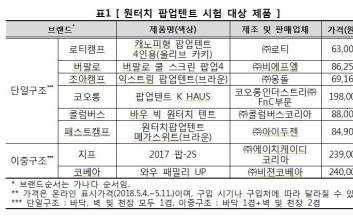 휴대성이 좋아 소비자들이 구매하는 ‘원터치 팝업텐트’가 방수, 자외선차단 등 기능면에서 차이를 보이는 것으로 나타났다. 소비자원이 8개 브랜드 제품에 대한 내구성·안전성 등 시험·평가를 진행했한 결과를 5일 발표했다. 대상 제품은 로티캠프 ‘캐노피형 팝업텐트 4인용(올리브 카키)’, 버팔로 ‘버팔로 쿨 스크린 팝업4’, 조아캠프 ‘익스트림 팝업텐트(브라운)’, 코오롱 ‘팝업텐트 K HAUS’, 콜럼버스 ‘바우 빅 원터치 텐트’, 패스트캠프 ‘원터치팝업텐트 메가스위트(브라운)’, 지프 ‘2017 팝-2S’, 코베아 ‘와우 패밀리 UP’ 등이다. 시험 결과, 폼알데하이드 등 유해물질은 전 제품이 이상이 없었으나, 내수성과 발수성 등의 기능성, 인열강도와 지퍼강도 등의 내구성은 제품에 따라 차이가 있었다. 또 텐트의 구조와 봉제선의 방수처리 등도 가격에 따라 차이를 보였다. 소비자원은 사용 목적에 적합한 기능을 갖춘 제품 선택이 필요하다고 권고했다. 먼저 텐트 내부로 빗물이 새지 않도록 막아주는 성능인 ‘내수성’을 평가한 결과, 코베아, 지프, 코오롱 제품이 상대적으로 우수했다. 빗물이 텐트 표면으로 흡수되지 않고 물방울로 굴러 떨어지는 성능인 ‘발수성’은 5개 제품(로티캠프, 코오롱, 패스트캠프, 지프, 코베아)이 우수해 텐트 표면이 빗물에 쉽게 젖지 않는 것으로 나타났다. 자외선 차당 성능이 가장 우수한 제품은 버팔로 제품이었다. 천이 쉽게 찢어지지 않는 정도를 평가한 내구성 시험에서는 코오롱과 패스트캠프 제품이, 지퍼부위가 쉽게 벌어지지 않는 정도를 평가한 결과에서는 지프와 코베아 제품이 좋았다. 표시사항을 확인하 결과, 로티캠프, 조아캠프, 콜럼버스 제품은 치수 등 표시가 미흡했고, 지프는 국내 난연성 평가 항목과 기준이 상이한 미국 기준으로 표시하고 있어 개선이 필요했다. 이에 따라 4개 회사는 표시 개선 의사를 밝혔다. 권지예 기자 kwon.jiye@jtbc.co.kr 2018.08.05 14:44