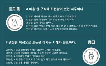 자료제공 : 점신 쥐띠 # 기대가 크면 실망도 크다. 현실적인 소망을 먼저 이루도록 하라. 48년생, 몸의 작은 상처라도 정성껏 치료해야 한다. 60년생, 상대방은 마음에 없는데 내 몸만 달았구나. 현실을 직시하자. 72년생, 다 끝낸 일이 다시 불거진다. 마무리를 잘 하자. 84년생, 친구들과의 약속은 다음으로 미루자. 96년생, 자신의 재주나 능력을 너무 과신마라. 소띠 # 마음이 잘 맞는 주위 사람과 상의하라. 작은 도움이 큰 결실을 맺는다. 49년생, 남쪽에 귀인이 있다. 도움을 청하라. 61년생, 좋은 운이 돌아오니 순리대로 처신하라. 73년생, 그동안 심고 가꾼 곡식이 알찬 열매를 맺는다. 85년생, 주위의 유혹이 많은 날이다. 97년생, 오해가 있다면 먼저 다가가라. 범띠 # 마음에 중심이 없고 흔들림이 많은 날이다. 50년생, 안정을 취하라. 심장과 소화기에 병이 들 수 있다. 62년생, 일을 추진하기에 앞서 마음의 안정을 찾아야 한다. 74년생, 매매는 이루어지나 큰 이익은 없겠다. 욕심 부리지 말라. 86년생, 지나친 신경은 건강을 해친다. 98년생, 먼 곳에서 즐거운 소식을 듣게되니 기쁘다. 토끼띠 # 마음 한 구석에 허전함이 있는 하루이다. 51년생, 계획에 차질이 생겨 짜증과 허탈감이 생긴다. 63년생, 일찍 귀가하여 가족과 함께 보내도록 하자. 75년생, 돈이 막히는 날이다. 87년생, 남을 탓하기 전에 나를 다시 한 번 돌아보자. 서쪽이 길한 방향이다. 99년생, 자신보다 힘없는 사람에게 예의있게 행동하라. 용띠 # 냉철한 이성으로 오늘을 이기는 지혜가 필요하다. 52년생, 사업의 확장이나 투자는 금물이다. 때를 기다리자. 64년생, 상대가 양보하지 않는다. 중요한 협상은 내일로 미루어라. 76년생, 아랫사람의 문제로 고민하게 된다. 88년생, 보기 좋은 감이 맛도 좋다고 했다. 자기 발전을 위해 매진하라. 00년생, 경쟁이나 내기를 하지마라. 뱀띠 # 끝까지 포기하지 말고 부딪혀 보자. 큰 공을 세우리라. 53년생, 자신이 진솔한데 두려울 것이 무엇인가? 강직하게 밀고 나가라. 65년생, 나날이 번창한다. 주머니가 배로 늘어난다. 77년생, 만족할만한 결과로 일이 마무리된다. 자축하라. 89년생, 노력을 닦은 결실이 맺어진다. 자신 있는 모습은 언제나 아름답다. 01년생, 너무 정에 얽매이다 손해를 본다. 말띠 # 고난은 참고 이기느냐의 과정이며 성공의 열쇠이다. 54년생, 황무지도 개척하면 옥토가 되는 법. 노력하면 얻는다. 66년생, 육신이 고달프니 이 내 몸이 외롭구나. 벗이 찾아온다. 78년생, 매매는 미루고 소송은 당기라. 이성을 잃지 마라. 90년생, 단비를 기다리는가? 노력하지 않으면 하늘은 응답하지 않는다. 02년생, 문서나 계약에 주의해라. 양띠 # 인간사 매사 튼튼히 노력하며 바른 마음을 가져야 한다. 55년생, 분주하고 소득이 없다. 기도가 최선이다. 67년생, 귀인이 도와주고 티끌 모아 태산이 되니 노력의 대가이다. 79년생, 결과에 연연하니 실력 발휘가 안 된다. 마음을 비우자. 91년생, 과감한 변신이 필요한 때 스스로를 혁신하라. 03년생, 친구의 작은 변화에 관심을 가져라. 원숭이띠 # 두려워 말라. 귀인의 도움을 받게 되어 해결될 것이다. 56년생, 귀하를 돕는 큰 업체와의 계약이 성사된다. 68년생, 다른 것에 한눈팔지 말라. 지금 하는 일을 유지해야 한다. 80년생, 친구나 가족의 사소한 것을 챙겨라. 92년생, 작은 성과에 기뻐하고 다음을 계획하라. 04년생, 잊어야 할 것은 빨리 잊는 것이 좋다. 닭띠 # 재능이 있으니 늦게라도 원하는 바는 이루어진다. 57년생, 지금은 조금 이른 시기이다. 조금해 하지 말고 기다려라. 69년생, 전업이나 개업은 삼가는 것이 좋다. 81년생, 소중한 것을 잃을 수 있으니 여행은 미루는 것이 좋다. 93년생, 먼저 정한 바를 고집하라. 이룰 수 있다. 05년생, 외모를 단정히하고 악세사리를 줄여라. 개띠 # 근신자중의 날이다. 욕구를 앞세우면 낭패를 할 수 있다. 58년생, 평생의 숙원이 목전에 있건만, 조금만 더 기다림이 좋을 듯하다. 70년생, 심신이 고달프다 깊은 호흡으로 마음을 가다듬자. 82년생, 가까운 친인척을 돌아보라. 도움을 받게 된다. 94년생, 금전운은 길하나 곧 나가게 된다. 과욕은 금물이다. 06년생, 자신을 필요로 하는 사람이 많아진다. 돼지띠 # 첫 단추를 잘 끼워야 한다. 경거망동을 삼가해라. 59년생, 지나치게 남에게 의존하는 것에 주의해라. 71년생, 누명이나 사기를 조심하라. 좌절하지 말라. 83년생, 시기와 다툼이 생기니 일찍 귀가하라. 95년생, 천리 길도 한 걸음부터이다. 긴 안목을 가도록 하라. 07년생, 떨어졌던 사람과 만나게된다.