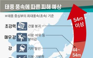한반도로 다가오는 10호 태풍 하이선(GIF) 5일 오전 5시~8시 [국가기상위성센터 홈페이지 캡처]초강력급 제10호 태풍 '하이선'이 세력을 점차 키우며 일본 열도 남서부 쪽으로 접근하고 있다. 최대 순간 풍속은 70m에 달한다. 5일 일본 기상청에 따르면 하이선은 오전 5시 기준 오키나와(沖繩) 동쪽의 미나미다이토(南大東)섬 남남동 약 280㎞ 해상에서 시속 15㎞의 속도로 서북서 방향으로 움직이고 있다. ‘하이선’의 중심기압은 920hPa로 현재 중심 부근의 최대풍속(초속)은 50m, 최대 순간풍속은 70m 수준을 기록하고 있다. 태풍의 강도는 중심 부근의 최대풍속(10분 평균)에 따라 초속 25m 이상∼33m 미만은 '중', 33m 이상∼44m 미만은 '강', 44m 이상∼54m 미만은 '매우 강', 54m 이상은 '초강력'으로 분류된다. 매우 강한 태풍은 사람이나 커다란 돌을 날리며 초강력 태풍은 건물을 무너뜨릴 수도 있다. 하이선의 영향으로 초속 15m 이상의 강풍이 부는 지역은 중심에서 북동쪽으로 500㎞, 남서쪽으로 390㎞에 달한다. 하이선은 이날 오후 3시쯤 중심 부근 최대풍속이 초속 55m, 최대 순간풍속은 75m의 한층 더 강력한 태풍으로 발달해 미나미다이토섬 남쪽 약 160㎞ 지점까지 이동할 전망이다. 이어 6일 오키나와와 아마미(奄美) 열도를 거쳐 7일 규슈(九州) 지방에 접근하거나 상륙한 뒤 한반도 쪽으로 진출할 것으로 예상된다. 일본 기상청은 1959년 5000명 이상의 사망자와 실종자를 낸 태풍 '이세만'에 버금갈 수 있다고 보면서 "이 정도 세력의 태풍이 근접하는 적은 별로 없으며 특별경계급이 될 우려가 있다"고 분석했다. 일본 국토교통성은 하이선에 의한 폭우 가능성에 대비해 태풍권에 들 것으로 예상되는 규슈지방 등 서일본 지역의 20여개 주요 댐에서 사전 방류에 들어갔다. 아베 신조(安倍晋三) 일본 총리는 전날 하이선 접근에 대비한 재해 대책 각료회의를 주재하며 "지자체의 피난 정보에 따라 신속하게 대피하고 생명을 지키는 행동을 해 달라"고 말했다. 함민정 기자 ham.minjung@joongang.co.kr