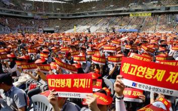 성과연봉제에 반대하기 위한 총파업 현장에 조합원 7만5000여 명이 참석했다. 전국금융산업노동조합(금융노조)는 23일 상암 월드컵경기장에서 7만5000여 명의 조합원이 집결한 가운데 성과연봉제를 결사 저지할 것이라고 밝혔다. 김문호 금융노조 위원장은 “이번 총파업은 금융노동자는 물론 한국의 모든 노동자를 지키기 위한 총파업 투쟁”이라며 “성과연봉제 강요에 굴하지 않고 저지해낼 것”이라고 밝혔다. 금융노조가 집계한 최종 참여 인원은 7만5234명이다. 김 위원장은 대회사에서 “은행권 조합원들이 총파업에 가는 것을 방해하기 위해 지점장들도 퇴근시키지 않고 감금시키며 파업에 참가하지 않겠다는 각서를 강요했다”며 “우리는 금융노동자와 한국 노동자, 노동계의 명운이 달린 이 싸움에서 절대 지지 않을 것”이라고 말했다. 금융노조는 이날 오후 조합원총회를 열고 후속 총력투쟁을 결의했다. 또 1차 금융노조 총파업을 계승해 10월부터 2, 3차 총파업 등을 포함한 쟁의행위를 지속적으로 전개할 예정이다. 쟁의행위 절차와 시기, 방법은 금융노조 위원장에게 위임한다는 안건을 만장일치로 의결하고 성과연봉제 저지를 위한 총력투쟁을 이어갈 것을 결의했다. 조은애 기자 cho.eunae@joins.com