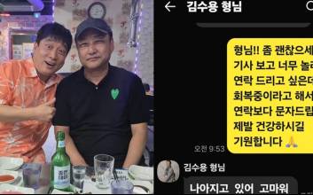 촬영 도중 쓰러져 응급실로 실려간 개그맨 김수용이 후배를 통해 근황을 전했다.17일 개그맨 윤석주는 자신의 SNS에 “개그맨 김수용 선배가 쓰러졌다는 소식을 듣고 깜짝 놀라서 메시지를 드렸다”는 글과 함께 김수용과 나눈 대화 캡처를 공개했다.캡처 속 윤석주가 “형님 괜찮으시냐. 걱정된다”고 하자 김수용은 “다행히 안 죽었다. 죽었다 살아났다”고 했다.윤석주가 “조의금 굳었다”고 농담을 하자 김수용 역시 “까비”(아깝다)라고 받아쳤다.앞서 16일 소속사는 “김수용이 13일 목요일에 유튜브 콘텐츠를 촬영하다가 의식을 잃어 응급실로 옮겨졌다”며 “현재는 의식을 되찾아 회복했다. 휴대폰도 할 수 있고 말도 할 수 있는 상태”라고 전했다.김수용은 당시 경기 가평군에서 유튜브 촬영을 하다 의식을 잃고 쓰러졌다. 소방 구급대가 심폐소생술 등을 한 뒤 구리 한양대병원 응급실로 이송했다. 위중한 상태였으나 호흡과 의식을 회복해 중환자실로 옮겨져 치료를 받았다.이에 윤석주는 “개그맨이란, 몸은 아파도 마음은 쉽게 주저앉지 않는 사람들이다”라며 “이 업계의 묘한 힘 오늘도 느낀다. 수용 선배, 얼른 회복하시길”이라고 응원했다.한편 김수용은 1991년 KBS 개그맨 공채 7기로 데뷔했으며 다양한 예능에서 활약했다. 최근에는 소속사 유튜브 채널 ‘비보티비’를 통해 수면 유도형 낭독 ASMR 콘텐츠 ‘꼬꼬문’을 선보이고 있다.이주인 기자 juin27@edaily.co.kr 2025.11.18 07:43