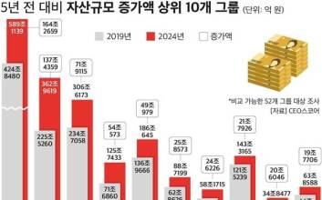 재계 1∼3위인 삼성·SK·현대차가 자산 증가액 순위에서도 상위권을 차지했다. 5년 새 5대 그룹(삼성·SK·현대차·LG·롯데)의 자산 규모는 450조원 가량 증가한 것으로 나타났다. 22일 CEO스코어가 공시대상기업집단(대기업집단) 중 2019년과 2024년 결산 기준 자산총액 비교가 가능한 52개 그룹을 조사한 결과, 전체 자산 규모는 2019년 1897조2869억원에서 작년 2709조853억원으로 811조7984억원(42.8%) 증가했다. 이 중 5대 그룹의 자산 규모는 1143조5705억원에서 1588조741억원으로 444조5036억원(38.9%) 증가해 나머지 47개 그룹의 총자산 증가액(367조2948억원)을 앞질렀다.삼성그룹은 5년 새 자산 규모가 164조원 늘어나 단일 그룹으로 최대 증가 폭을 기록했다. 삼성의 총자산은 424조8480억원에서 589조1139억원으로 38.7% 증가했다.SK그룹도 SK하이닉스의 성장에 힘입어 2022년 이후 재계 2위 자리를 유지했다. SK의 자산 규모는 225조5260억원에서 362조9619억원으로 137조4359억원(60.9%) 늘었다.현대차그룹은 글로벌 판매 호조와 배터리, 모빌리티 사업 확장에 따라 자산 규모가 234조7058억원에서 306조6173억원으로 71조9115억원(30.6%) 증가했다.이어 한화(54조573억원), LG(49조979억원), HD현대(25조8573억원), 한진(24조6226억원), 롯데(21조7926억원), 카카오(20조6046억원), 신세계(19조7706억원) 순으로 자산 규모 증가액이 컸다.증가율 기준으로는 중흥건설이 217.5%(18조3111억원)로 가장 높았다. 중흥건설은 2021년 대우건설 인수 효과가 본격 반영되며, 자산이 3년 새 3배 이상 급성장했다.조사 대상 52개 그룹 중 5년 전보다 자산이 축소된 그룹은 교보생명보험(2조4754억원), 부영(1조8313억원), 두산(1조10005억원↓) 3곳이다.CEO스코어는 "최근 5년간 매출액과 영업이익 등 지표에서도 상위 5대 그룹이 나머지 47개 그룹보다 앞서 실적 쏠림 현상이 뚜렷했다"며 "다만 LG와 롯데는 이차전지, 화학, 건설 등 일부 계열사의 적자 영향으로 영업이익이 감소했다"고 분석했다.김두용 기자 2025.10.22 15:10