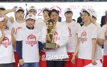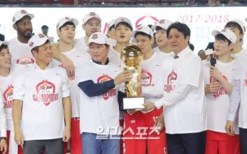 [포토]최태원SK그룹 회장, 감격의 농구 우승 트로피