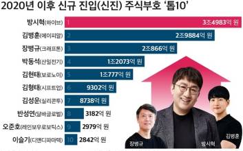 2020년 이후 상장 주식부호 1위 방시혁, 2위 김병훈, 3위 장병규