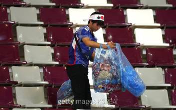 파란 봉투 들고 자발적 청소... '기적승' 더 빛낸 일본의 매너
