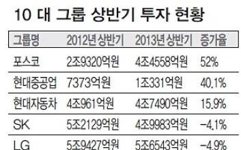 국내 10대 그룹의 상반기 투자 규모가 8% 이상 감소한 것으로 나타났다. 26일 기업경영평가 사이트인 CEO스코어가 반기보고서를 제출하고 최근 2년간 비교가 가능한 10대 그룹 계열사 75개사의 투자(유무형자산취득) 현황을 조사한 결과, 이들의 올 상반기 총 투자규모는 36조702억 원으로 전년 같은 기간 39조2881억 원에 비해 8.2%가 감소했다 10대 그룹 중 투자를 늘린 곳은 현대차, 포스코, 현대중공업 등 3개뿐이었으며 , 나머지 삼성, SK, LG, 롯데, GS, 한진, 한화그룹은 일제히 투자를 줄인 것으로 집계됐다.그룹별로는 회장 공석사태가 1년 이상 지속되고 있는 한화(회장 김승연)가 36.1%의 투자 감소율로 1위를 차지했다.하지만 금액 면에서는 투자 2위인 삼성(회장 이건희)이 압도적 영향력을 행사했다. 삼성그룹은 작년 상반기 16조6천여억 원에서 올 상반기에는 12조 원을 투자, 27.8%의 투자 하락률을 기록했다. 금액으론 4조6180억 원으로, 10대 그룹 전체 감소분 3조2179억 원을 상회했다. 사실상 10대그룹의 투자액 감소는 삼성그룹의 투자 축소에서 비롯된 셈이다. 이밖에 GS( -15.5%), 롯데(-11.1%), 한진(-11.0%), LG(-4.9%), SK(-4.1%)도 일제히 투자를 줄였다.반대로 투자를 늘린 곳은 포스코, 현대중공업, 현대차 등 3개 그룹이었다. 포스코는 지난해 상반기 2조9320억 원에서 올 상반기에는 4조4558억 원으로 52.0%나 투자를 늘렸고, 현대중공업(40.1%)과 현대자동차(15.9%)그룹도 투자 확대 대열에 동참했다.상위 5대 그룹의 계열사별 투자를 살펴보면, 재계 1위인 삼성은 작년 4월 출범한 삼성디스플레이를 제외한 14개 조사대상 중 삼성엔지니어링(-79.3%), 삼성물산(-53.5%), 삼성전자(-34.3%) 등 9개사가 투자를 줄였다. 반대로 투자를 늘린 곳은 삼성토탈(126.8%), 삼성SDI(118.6%), 삼성중공업(25.5%) 등 5개사에 불과했다. 특히 삼성전자는 지난해 상반기보다 투자를 4조8629억원이나 줄여 삼성그룹의 투자 축소를 이끌었다. 반대로 현대차그룹은 조사대상 10개 계열사 중 현대모비스(-15.1%), 기아차(-13.3%), 현대위아(-6.4%) 등 3개사만 투자를 줄이고, 현대건설(149.3%), 현대엔지니어링(94.8%), 현대제철(31.0%), 현대차(12.6%) 등 나머지 7개사는 투자를 확대했다.최태원 회장이 옥중에 있는 SK그룹은 SK가스(-78.7%), SK하이닉스(-29.7%), SK텔레콤(-10.4%) 등 4개사가 투자를 줄인 반면, 코원에너지서비스(356.7%), SK C&C(149.1%), SK이노베이션(42.8%) 등 8개사가 투자를 확대했다.LG그룹은 LG실트론(-42.7%), LG화학(-30.0%) 등 6개사가 투자를 줄였고, 반대로 LG이노텍(117.5%), LG전자(51.9%) 등 5개사는 투자를 확대했다.마지막으로 재계 5위인 롯데(회장 신동빈)는 8개 조사대상 계열사 중 투자를 줄인 곳도 롯데케미칼(-66.9%), 롯데건설(-60.4%) 등 4개사였고, 늘린 곳도 롯데제과(101.7%), 롯데쇼핑(.6.2%) 등 4개사였다.10대 그룹 계열사 75개 전체적으로 보면, 올 상반기에 투자를 늘린 곳이 52%인 39개사였고, 줄인 곳은 36개사(48%)였다. 기업별 투자 증가율 '톱5'는 코원에너지서비스(356.7%), 포스코건설(262.8%), 포스코에너지(257.3%), GS글로벌(252.3%), 현대오일뱅크(171.0%) 순이었고, 투자 감소율 '톱5'는 포스코강판(-85.5%), 삼성엔지니어링(-79.3%), SK가스(-78.7%), 롯데케미칼(-66.9%), 한화건설(-62.8%) 순이었다.이형구 기자 ninelee@joongng.co.kr 2013.08.27 07:00