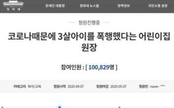 경기 파주경찰서는 운정신도시 내 한 어린이집에서 아동 학대를 당했다는 신고를 받고 조사 중이다. 8일 파주경찰서 등에 따르면 운정신도시의 한 어린이집에서 3살 원아가 원장으로부터 폭행을 당했다며 피해 어린이의 어머니가 지난 3일 아동학대로 신고했다. 아이는 적응 기간을 포함해 해당 어린이집에 16일 동안 등원한 것으로 전해졌다. 경찰 관계자는 “아동 학대가 있었는지 등을 확인하기 위해 폐쇄회로(CC)TV를 확보해 디지털 포렌식 분석작업 중”이라며 “해당 원장은 이번 주 중 조사를 진행할 예정”이라고 말했다. 피해 어린이의 어머니는 지난 7일 청와대 국민청원 게시판에 ‘코로나 때문에 3살 아이를 폭행했다는 어린이집 원장’이란 글을 올려 피해를 주장했다. 피해 어린이 어머니가 어린이집 원장을 처벌해달라고 올린 청와대 국민청원에는 하루 만인 8일 오후 3시 45분 현재 8만명 이상이 동의했다. 피해 어린이 어머니는 국민청원 게시판에“하원 시키러 갔다가 아이가 다쳤다는 것을 알게 됐고, 집으로 가는 차 안에서 얼굴에 또 다른 상처를 발견했다”며 “하원 하는 동안 아이의 눈에는 초점이 나가 있었고, 그날 저녁 아이는 평소와 다르게 손을 비비는 행동을 보이고 머리를 자해하며 악을 쓰고 소리를 질렀다”고 설명했다. 이어 “다음날 병원을 찾아 의사로부터 ‘어린이집에 가서 CCTV를 확인해 보는 게 좋을 것 같다’는 소견을 들었다”며 “이후 어린이집에 가서 CCTV를 확인한 결과 원장이 휴대전화로 아이의 머리를 때리는 장면과 뺨을 10여 차례 때리는 모습이 모두 담겨있었다”고 주장했다. 그는 “신고를 하고 경찰이 와서 원장 말을 들어보니 원장은 ‘코로나로 원아 모집이 잘 안 돼 스트레스를 받아 어린아이에게 화풀이했다’고 말했다”고 전했다. 한편 파주시도 아동 학대가 확인되면 해당 어린이집 운영 정지나 원장에 대한 자격 정지 등 조처에 나설 계획이라고 밝혔다. 이지영 기자 lee.jiyoung2@joongang.co.kr