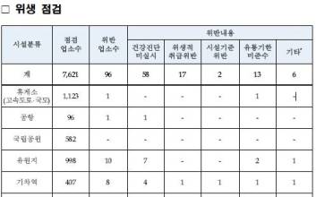 고속도로 휴게소나 유원지 등에서 판매 중인 맘스터치·한솥도시락·김밥천국 업소들이 위생 기준을 위반하거나 유통기한이 지난 제품을 보관하다가 적발됐다.10일 식품 업계에 따르면, 식품의약품안전처(식약처)는 봄철 이용객이 증가하는 고속도로 휴게소·유원지 등 다중 이용 식품취급업소 7621곳을 점검한 결과, 식품위생법을 위반한 96곳을 적발했다.이번 점검은 6개 지방청과 17개 지방자치단체가 지난달 18~22일 전국에 있는 고속도로 휴게소·철도역·터미널·공항·유원지 인근 음식점 등을 대상으로 실시했다.주요 위반 내용을 보면, 유통기한 경과 제품 보관·사용(13곳) 위생적 취급 기준 위반(17곳) 시설 기준 위반(2곳) 건강진단 미실시(58곳) 등이다.적발된 업체 중에는 고봉민김밥·김가네·불닭발땡초 동대문엽기떡볶이·써브웨이·버거킹 등 유명 프랜차이즈점과 세븐일레븐 및 GS25 등 편의점도 포함됐다.이들 업체는 관할 지자체가 행정 처분 등 조치를 실시하고, 3개월 이내에 다시 점검해 개선 여부를 확인할 예정이다.아울러 봄나들이 철에 많이 찾는 햄버거·샌드위치 등 조리 식품 904건을 수거해 검사한 결과, 맘스터치와 한솥도시락 제품 3건에서 대장균·식중독균이 기준 초과 검출돼 해당 제품 폐기·영업 정지 등 조치를 했다. 식약처 관계자는 "앞으로도 시기에 따라 국민이 많이 이용하는 다중 이용 식품취급 시설에 대해 사전 안전 관리를 철저히 할 계획"이라고 말했다. 안민구 기자 an.mingu@jtbc.co.kr ○ 식약처 위생 점검 결과-------------------------------------------------------------------------------------------------------------시설 분류 점검 업소 수 위반 업소 수 위반 내용 건강진단 미실시 위생적 취급 위반 시설 기준 위반 유통기한 미준수 기타-------------------------------------------------------------------------------------------------------------휴게소 1123 1 - - - 1 -공항 96 1 1 - - - -국립공원 582 - - - - - -유원지 998 10 7 - - 2 1기차역 407 8 4 1 1 1 1터미널 784 16 9 5 - 2 -놀이공원 280 2 - - - 1 1기타 3351 58 37 11 1 6 3-------------------------------------------------------------------------------------------------------------계 7621 96 58 17 2 13 6-------------------------------------------------------------------------------------------------------------자료=식약처 2019.04.11 07:00