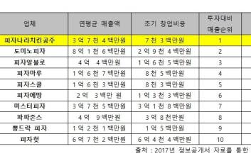 초기창업 투자대비 매출순위 1위 ‘피자나라치킨공주’…연 평균 매출액 1위 ‘도미노피자’
