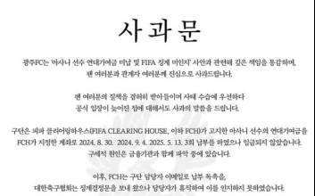 ▲다음은 광주FC 사과문 전문.광주FC는 ‘아사니 선수 연대기여금 미납 및 FIFA 징계 미인지’ 사안과 관련해 깊은 책임을 통감하며, 팬 여러분과 관계자 여러분께 진심으로 사과드립니다. 팬 여러분의 질책을 겸허히 받아들이며 사태 수습에 우선하다 공식 입장이 늦어진 점에 대해서도 사과의 말씀을 드립니다.   구단은 피파 클리어링하우스(FIFA Clearing House, 이하 FCH)가 고지한 아사니 선수의 연대기여금을 FCH가 지정한 계좌로 2024. 8. 30. 2024. 9. 4. 2025. 5. 13. 3회 납부를 하였으나 입금되지 않았습니다. 구체적 원인은 금융기관과 함께 파악 중에 있습니다. 이후, FCH는 구단 담당자 이메일로 납부 독촉을, 대한축구협회는 징계결정문을 보내 왔으나 담당자가 휴직하여 이를 인지하지 못하였습니다. 최근, 구단은 이 사실을 인지한 즉시 FCH와 소통하여 연대기여금 납부하였으며 5. 21. 납부가 완료되었다는 최종 통보를 받았습니다. 이번 사태와 관련하여 구단은 업무 공백에 대한 부분을 엄중하게 판단하고 있으며, 책임있는 자세로 내부 시스템을 점검하고 프로세스를 재정비하겠습니다. 철저한 원인 조사를 통해 책임 소재를 밝히고 향후 유사한 문제가 재발하지 않도록 하겠습니다. 또한 FIFA, AFC, 대한축구협회, 한국프로축구연맹 등 관련 기관과 긴밀히 협조하여 본 사안의 원만한 수습될 수 있도록 최선을 다하겠습니다. 팬 여러분과 관계 기관 여러분께 큰 실망과 걱정을 끼쳐드린 점에 대해 다시 한번 깊이 사과드립니다. 앞으로는 더욱 투명하고 신뢰받는 구단이 되기 위해 전 임직원이 한마음으로 노력하겠습니다.광주시민프로축구단김희웅 기자