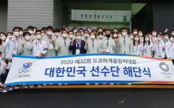 2020 도쿄올림픽 대한민국 선수단이 선수촌에서 해단식을 열였다. 한국은 9일 오전 11시 일본 도쿄 하루미에 있는 올림픽 선수촌 숙소동 앞 광장에서 해단식을 개최하고, 신치용 선수단 부단장이 이기흥 대한체육회장에게 성적을 보고했다. 또한 장인화 선수단장은 단기를 체육회에 반환했다. 이기흥 체육회장은 "신종 코로나바이러스 감염증(코로나19) 세계적 대유행으로 올림픽이 1년 연기되는 등 역대 올림픽 중 가장 여건이 좋지 않은 상황에서도 다양한 종목에서 세계 정상급 기량을 보여준 선수들에게 감사한다"고 했다. 이어 "특히 메달이나 승패와 상관없이 올림픽을 순수하게 즐기고, 행복하고 당당하게 임하는 모습으로 진정한 스포츠가 무엇인지 보여줬다"고 선수단을 격려했다. 이번 대회 29개 종목에 걸쳐 354명이 파견된 한국은 금메달 6개, 은메달 4개, 동메달 10개를 획득해 종합 순위 16위를 차지했다. 배구, 육상, 근대 5종 3개 종목 선수와 지도자, 본부 임원을 합쳐 60명은 이날 오후 7시 55분 인천국제공항으로 귀국한다. 이형석 기자 2021.08.09 14:16