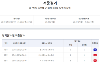 국민체육진흥공단이 발행하는 체육진흥투표권 스포츠토토의 수탁사업자 스포츠토토코리아가 지난 23일(일)부터 24일(월)까지 진행된 네이션스리그 등 A매치 14경기를 대상으로 하는 축구토토 승무패 21회차 게임의 적중 결과를 발표했다. 공식 인터넷 발매 사이트 베트맨이 3월 24일 발표한 적중결과에 따르면, 축구토토 승무패 21회차에서 1등 적중은 30건이 발생했다. 1등 적중자는 이에 따라 3,866만 6,450원을 받을 수 있다. 1등 적중자 30명은 최소 1,000원부터 최대 9만 6,000원을 구매한 것으로 알려졌으며, 9만 6,000원의 구매자는 1등 1건, 2등 7건, 3등 20건, 4등 30건 등 총 58건을 동시 적중해 4,172만 850원을 수령할 수 있는 것으로 알려졌다. 1등 이외에 2등부터 4등의 적중건수 및 개별 환급금액은 2등(749건/36만 6,600원), 3등(8,284건/1만 6,580원), 4등(49,805건/5,520원)이었으며, 1등부터 4등까지 합산한 총 적중건수는 58,868건이며, 지난 회차에서 이월된 1등 적중금 4억 7,355만 3.500원을 포함해 모든 적중금을 합산한 금액은 18억 4,684만 9,220원이었다. 이어 진행되는 축구토토 승무패 22회차는 오는 24일 오전 8시에 발매를 개시해 25일 오후 8시까지 구매가 가능하다. 승무패 22회차는 전국 스포츠토토 판매점 및 공식 인터넷 발매 사이트 베트맨을 통해 구매가 가능하다.