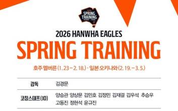 한화 이글스가 2026년 스프링캠프를 시작한다.한화 선수단은 23일 인천국제공항을 통해 호주 멜버른으로 출국한다. 1차 인원 구성은 김경문 감독을 포함한 코칭스태프 17명, 선수 46명 등 총 63명 규모로 1차 스프링캠프 명단을 꾸렸다. 여기에는 내야수 최유빈, 외야수 오재원 등 2명의 신인 선수가 포함됐다. 또한 외국인 투수 오웬 화이트는 호주 현지로 합류한다.