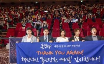 설경구가 불한당원들에 대한 아낌없는 애정과 고마움을 표했다.17일 서울 잠실 월드타워 롯데시네마에서 열린 영화 '불한당: 나쁜놈들의 세상(이하 '불한당'·변성현 감독)' 개봉 1주년 기념 상영회 'Thank You Again'에서 설경구는 "배우로서 귀한 경험을 했다. 우리는 천운을 받은 배우들 같다"고 말했다. 지난해 5월 개봉한 '불한당'은 범죄 조직 1인자를 노리는 재호(설경구)와 세상 무서운 것 없이 패기 넘치는 신참 현수(임시완)가 교도소에서 만나 의리를 다지고, 출소 이후 의기투합하던 중 서로에 대해 새로운 사실을 알게 되면서 벌어지는 범죄 액션 드라마다. 영화 종영 시점인 6월 말 기준 '불한당'의 누적관객수는 93만명이었지만, 팬들의 자발적인 단체관람으로 2018년 5월 기준 2만여 명의 관객이 증가한 95만명을 기록했다. '불한당' 팬덤을 일컫는 불한당원들은 개봉 후 1년간 약 약 70회의 단체 관람을 진행한 것으로 추정된다. 이들은 작품 뿐만 아니라 감독과 배우들에 대한 맹목적 사랑을 표하고 있다. 불한당원들은 영화도 팬덤을 이끌 수 있다는 것을 보여준 첫번째 사례로, 아이돌 출신 임시완을 제외하고 충무로에 잔뼈가 굵은 설경구, 김희원, 전혜진, 허준호 등 중견 배우들은 데뷔 이래 처음으로 아이돌 뺨치게 쏟아지는 이례적 환호에 놀라움을 금치 못했다.특히 설경구는 '지천명 아이돌'이라는 별명까지 생길 정도로 이미지 쇄신은 물론, 배우로서 쉽게 끝나지 않을 것으로 보이는 제2의 전성기를 구가 중이다. 이에 대해 설경구는 "지난해부터 각종 시상식에서 영화제를 빛내 주신 거도 너무 감사하다. 최근 '버닝' VIP시사회를 갔는데 거기서도 영화 관계자 분들이 불한당원 이야기를 하더라"며 "불한당원은 한국 영화계에 한 획을 그었다. 기억될 것이고 영화계 내에서도 큰 존재가 될 것이다"고 거듭 강조했다.조연경 기자 cho.yeongyeong@jtbc.co.kr 2018.05.18 15:09
