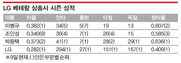 LG 베테랑 이병규(37·등번호 9) 조인성(36) 박용택(32)의 초반 질주가 놀랍다.
