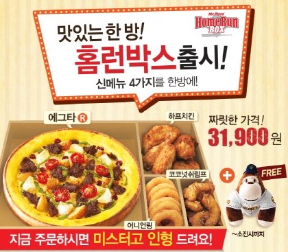 미스터피자는 홈런박스 출시를 기념해 홈런박스 주문시 영화 ‘미스터고’의 고릴라 주인공 ‘링링’ 인형을 증정한다. 홈런박스의 가격은 3만1900원이다.