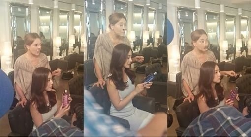 공개된 사진 속의 김태희는 몸에 쫙 붙는 하늘색 원피스를 입고 미용실 의자에 앉아 메이크업 아티스트와 대화를 나누고 있다. 김태희의 손에는 헤어제품으로 보이는 제품을 들고 있어 관심이 집중 되고 있다.