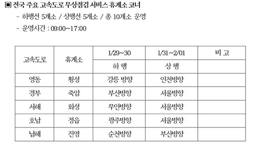 쌍용차가 판매한 전차종(대형상용차 제외)을 대상으로 실시하는 특별 무상점검 서비스는 하행선이 1월 29일~30일까지, 상행선은 31일~2월 1일까지 △경부(죽암) △영동(횡성) △서해안(화성) △호남(정읍) △남해(진영)고속도로 하·상행선 휴게소 코너에서 오전 9시부터 오후 5시까지 실시한다(표 참조).