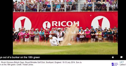 안선주가 브리티시여자오픈 3라운드 마지막 18번 홀 그린 사이드에서 벙커 샷을 하고 있다. 안선주는 이 샷에 앞서 스탠스를 취하는 과정때 벙커 라이를 개선했다는 경기위원회의 판정에 따라 2벌타를 받았다. 사진=LET 홈페이지 캡처