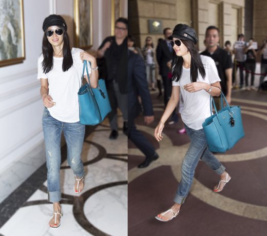 전지현이 지난 26일 대만에서 열린 구찌 2014-2015 FW컬렉션 패션쇼 참석 후 입국 한 가운데, 편안하면서도 감각 있는 공항 패션을 선보여 화제가 되고 있다. 전지현은 구찌 비아찌오 라인의 저지 화이트 티셔츠와 프리-폴 컬렉션의 라이트 블루 데님으로 내추럴 시크 공항 룩을 연출했다. 공항 패션의 필수품인 선글라스와 홀스빗 디테일이 돋보이는 티 스트랩 슈즈로 편안해 보이지만 멋스러운 젯-셋룩의 정석을 선보였고, 딥 코발트 컬러의 미니멀한 구찌 스윙 백으로 스타일에 생동감을 주었다.