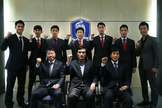 사진설명=축구협회가 월드컵 심판 퓨처트리오 프로젝트을 시행 중이다. 정해성 심판위원장과 안기헌 전무이사(앞줄 왼쪽에서 1,2번째)와 프로젝트에 참가하고 있는 심판들. [제공=대한축구협회]