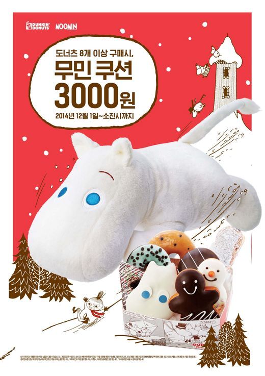 던킨도너츠는 크리스마스 도넛과 케이크 출시를 기념해 ‘무민 쿠션’ 프로모션을 실시한다. ‘무민’은 북유럽 신화에 나오는 트롤(요정)을 캐릭터화한 것으로, 핀란드에서는 국민 캐릭터라 불릴 정도로 큰 인기를 끌고 있는 캐릭터다. 무민 쿠션은 도넛 8개 이상 구매 시 3,000원, 크리스마스 케이크 구매 시에는 2,000원에 구매할 수 있다. 이번 프로모션은 결제영수증 1건당 1회 참여 가능하며, 무민 쿠션 개별 구매는 불가하다. 자세한 내용은 홈페이지를 통해 확인할 수 있다. 기간은 소진 시까지. (일부 매장 제외)