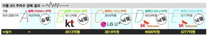 특히 LG유플러스는 '황금 주파수'로 꼽혔던 C블록(2.1㎓대역)을 최저경쟁가격인 3816억원에 낙찰받았다.