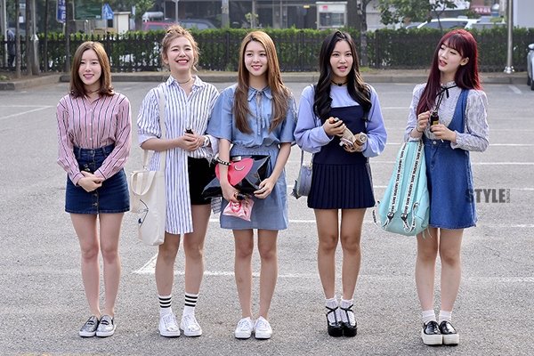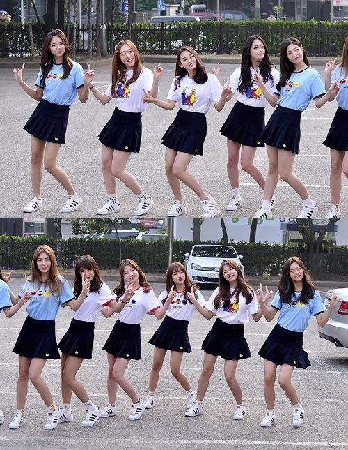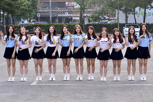 아이오아이는 멤버 모두가 똑같은 테니스스커트를 착용했다. 캐릭터 티셔츠까지 매치해 사랑스러운 룩을 완성했다.