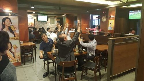 2018 러시아월드컵 아시아지역 최종예선 A조 3차전(카타르전)이 열린 6일 오후 8시 서울 중구에 위치한 레벤브로이호프를 찾은 시민들의 눈은 매장 중간에 설치된 대형 스크린에 고정돼 있었다.