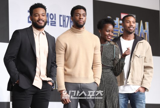 배우 채드윅 보스만, 마이클 B. 조던, 쿠피타 뇽이 5일 오전 서울 중구 포시즌스호텔에서 열린 영화 ‘블랙팬서’ 기자회견에 참석해 포토타임을 갖고 있다.