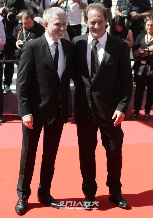 스테판 브리제 감독과 배우 뱅상 랭동이 15일(현지시간) 오후 프랑스 칸 팔레 드 페스티발에서 열린 '제 71회 칸 국제영화제'(Cannes Film Festival) 경쟁부문에 진출한 ‘앳 워’ 레드카펫에 참석하고 있다.