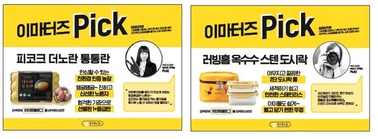 이마트가 공식 서포터스인 '이마터즈'가 추천하는 상품을 점내 고지물(ISP)과 블로그, 애플리케이션 등에서 소개한다고 20일 밝혔다. 매장 출입구나 주요 동선에 배너와 포스터로 상품을 소개하고, 가격 표시기 옆에는 '이마터즈 픽'이라고 표시해 고객들의 쇼핑을 돕는다. 이마터즈 픽은 이마터즈들이 매달 20일까지 직접 남긴 상품 후기를 바탕으로 집행위원들이 상품을 선정해 소개하는 방식이다. 첫 이마터즈 픽 상품은 '피코크 더 노란 통통란'과 '러빙홈 옥수수 스탠 도시락' 'JAJU 2단 트롤리 세탁 햄퍼'가 꼽혔다.