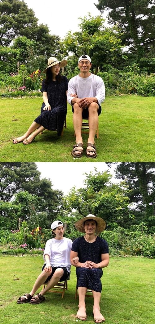 공개된 사진에는 서로의 옷을 바꿔 입고 포즈를 취하고 있는 김재우 부부의 모습이 담겨있다. 특히 김재우는 아내의 작은 구두에 발가락 3개만 간신히 넣은 채 환하게 웃고 있어 눈길을 끈다.