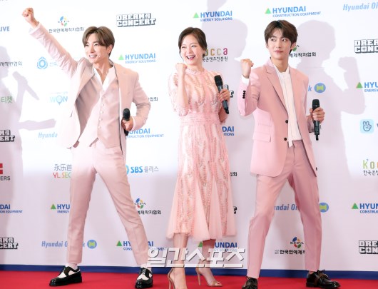 MC를 맡은 이특, 전소민, 공찬이 18일 오후 서울 마포구 서울월드컵경기장에서 열린 제 25회 '2019 드림콘서트' 레드카펫에서 포토타임을 갖고 있다.
