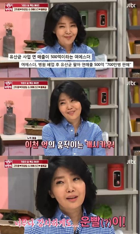 이날 MC 김성주는 "여에스더의 유산균 사업이 대박 나서 연 매출이 500억, 누적 매출이 2000억이라고 한다"고 소개했다. 이에 홍혜걸은 "움직이는 캐시카우다"라고 말했다.