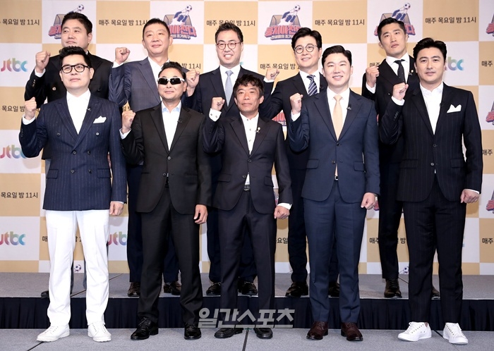 18일 오전 서울 마포구 도화동에 위치한 한 호텔에서 JTBC 신규 예능 '뭉쳐야 찬다' 기자간담회가 진행됐다. 성치경 CP, 김용만, 김성주, 안정환, 이만기, 허재, 양준혁, 이봉주, 심권호, 진종오, 김동현이 참석했다.