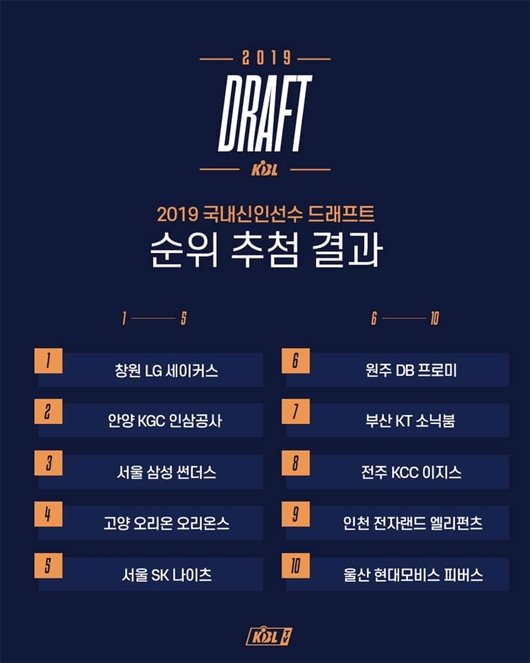 KBL 제공 KBL 10개 팀은 이날 추첨으로 정해진 지명권을 가지고 11월 4일 잠실학생체육관에서 열리는 신인 선수 드래프트에 나선다. 이번 드래프트에선 박정현, 이윤수 외에도 김경원(연세대) 박찬호(경희대) 등 대학 무대에서 활약한 대어급 빅맨 선수들과, 탁월한 신체 능력을 앞세워 시선을 끈 고려대학교 3학년 가드 김진영 등이 상위 지명을 받을 것으로 예상되고 있다.