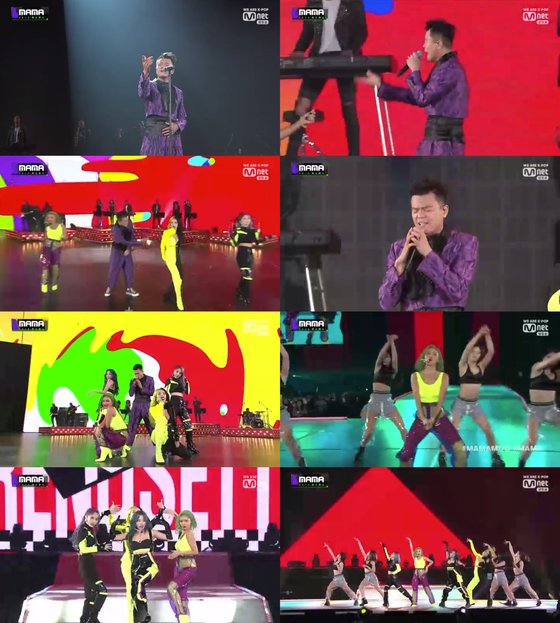 박진영 마마무./2019 MAMA 가수 박진영이 '2019 MAMA'에서 파격을 선사했다. 비닐옷을 입은 등장부터 신곡 퍼포먼스까지 독보적 무대를 선사했다.