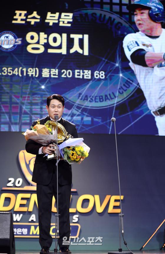 '2019 신한은행 마이카 KBO 골든글러브' 시상식이 9일 오후 서울 삼성동 코엑스 오디토리엄에서 열렸다. 포수부문을 수상한 양의지가 수상소감을 밝히고 있다. 김민규 기자 최고 선수, 최고 포수인 양의지(32·NC)는 리그 최고의 선수 2명을 바라봤다. 자신이 신인왕을 받은 2010년 시상식에서 시즌 최우수선수(MVP)에 오른 이대호에게 눈길을 뒀다. 타격 7관왕에 오른 이대호를 보며 '나도 해보고 싶다'는 생각을 했다고. 그리고 올 시즌 이만수 전 SK 감독에 이어 35년 만에 포수 타격왕에 오르는 등 타격 3관왕을 해냈다. 그는 지난달 열린 2019 KBO리그 시상식에서 "꿈을 이룰 수 있게 돼 영광이다"고 했다.