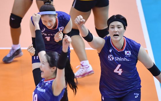 지난 12일 펼쳐진 2020도쿄올림픽 아시아대륙예선 결승전 태국과 경기에서 승리 후 환호하는 김수지(11번)과 김희진(4번). FIVB 제공 궂은일을 도맡았다. 부상에도 투혼을 발휘했다. 여자 배구의 3회 연속 올림픽 진출을 이끈 김수지(33)와 김희진(29), '알토스 듀오' 얘기다.