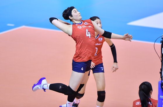사진=FIVB 제공 김희진은 대표 전부터 코칭 스태프가 꼽은 키플레이어였다. 왼쪽으로 편중되는 오픈 공격을 분산시키려면 그가 오른쪽에서 균형을 맞춰줘야 했다. 그러나 변수가 있었다. 소속팀에서는 주로 센터로 나섰다. 3라운드 후반부터는 종아리 부상 탓에 출전도 줄었다.