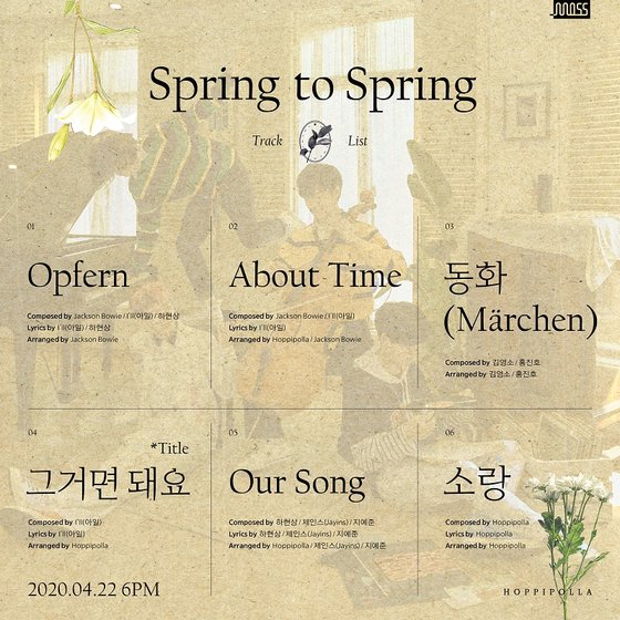 호피폴라는 지난 13일 공식 SNS를 통해 22일 오후 6시에 발매되는 미니앨범 ‘Spring to Spring’의 트랙리스트 이미지를 공개하며 컴백에 대한 기대감을 높였다. 타이틀곡 ‘그거면 돼요’를 비롯해 ‘동화(Märchen)’, ‘Our Song’, ‘소랑’과 함께 지난해 발표한 더블 싱글에 수록됐던 ‘Opfern’, ‘About Time’까지 총 6개 트랙이 오픈됐다.