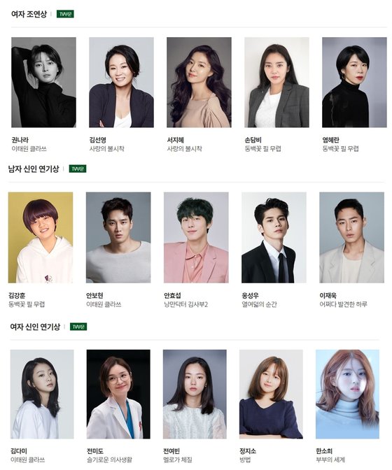 '동백꽃 필 무렵'도 빠질 수 없다. 공효진·강하늘·오정세·염혜란·손담비·이정은·김강훈 등 지난해 '동백꽃'의 여운을 다시 느낄 수 있다. JTBC '이태원 클라쓰'도 마찬가지. 박서준·김다미·유재명·권나라·안보현 등 모두가 각자의 자리에서 트로피를 받는 영광을 꿈꾼다. 비지상파 최고 시청률의 역사를 쓴 '부부의 세계'도 드라마 종영의 여운을 달랜다. 김희애·박해준·한소희가 나란히 앉는다.